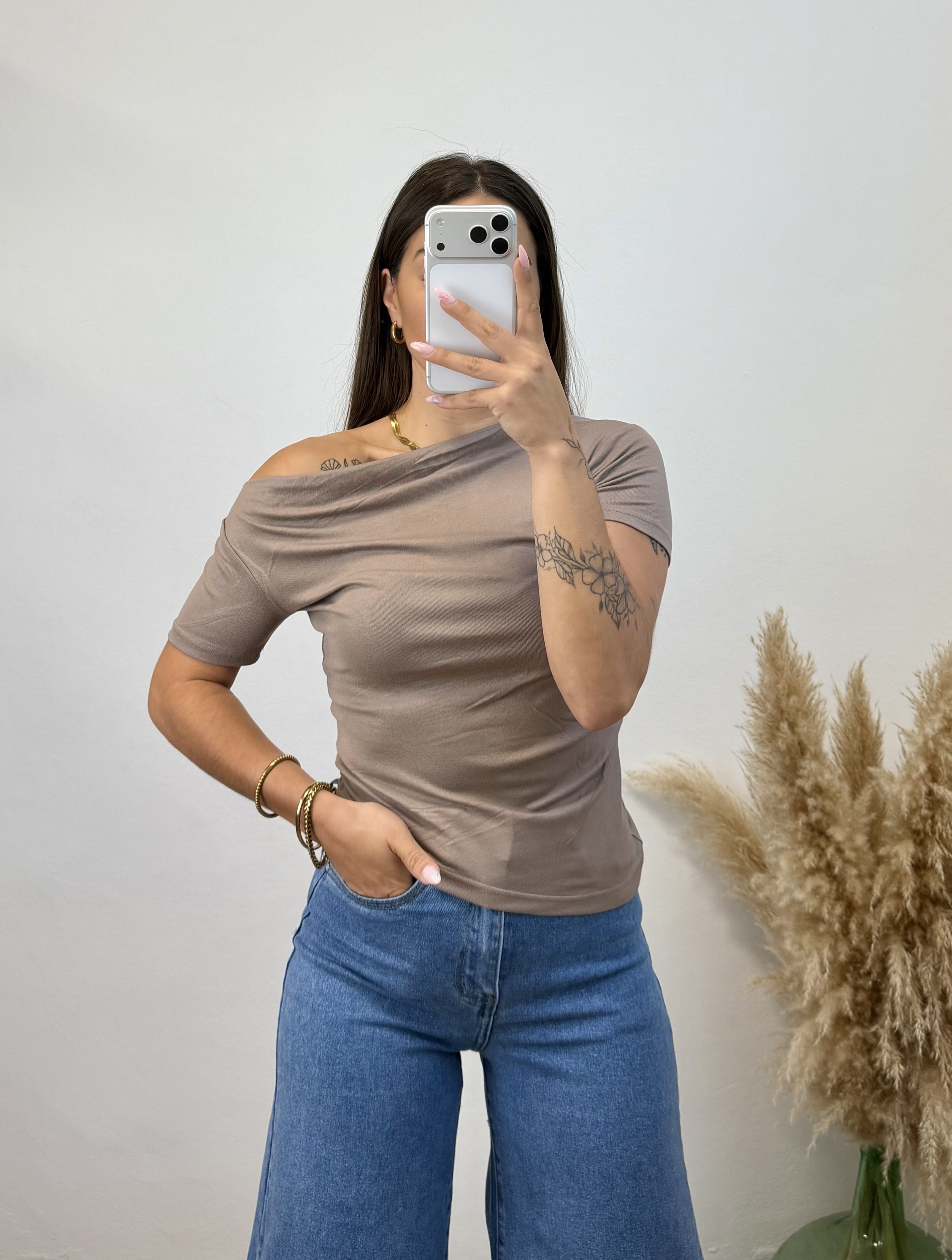 Camiseta asimetrica manga corta – Taupe