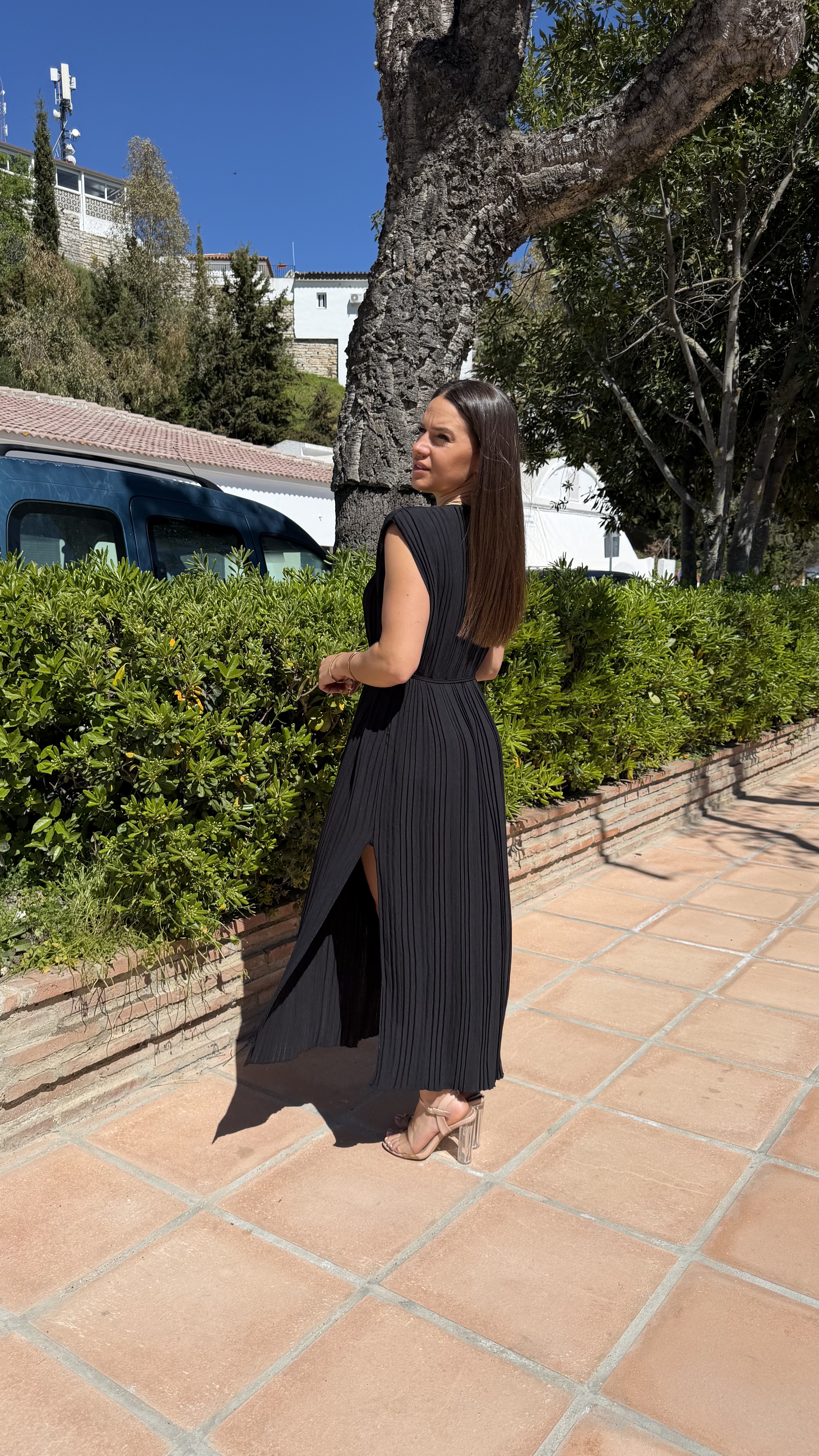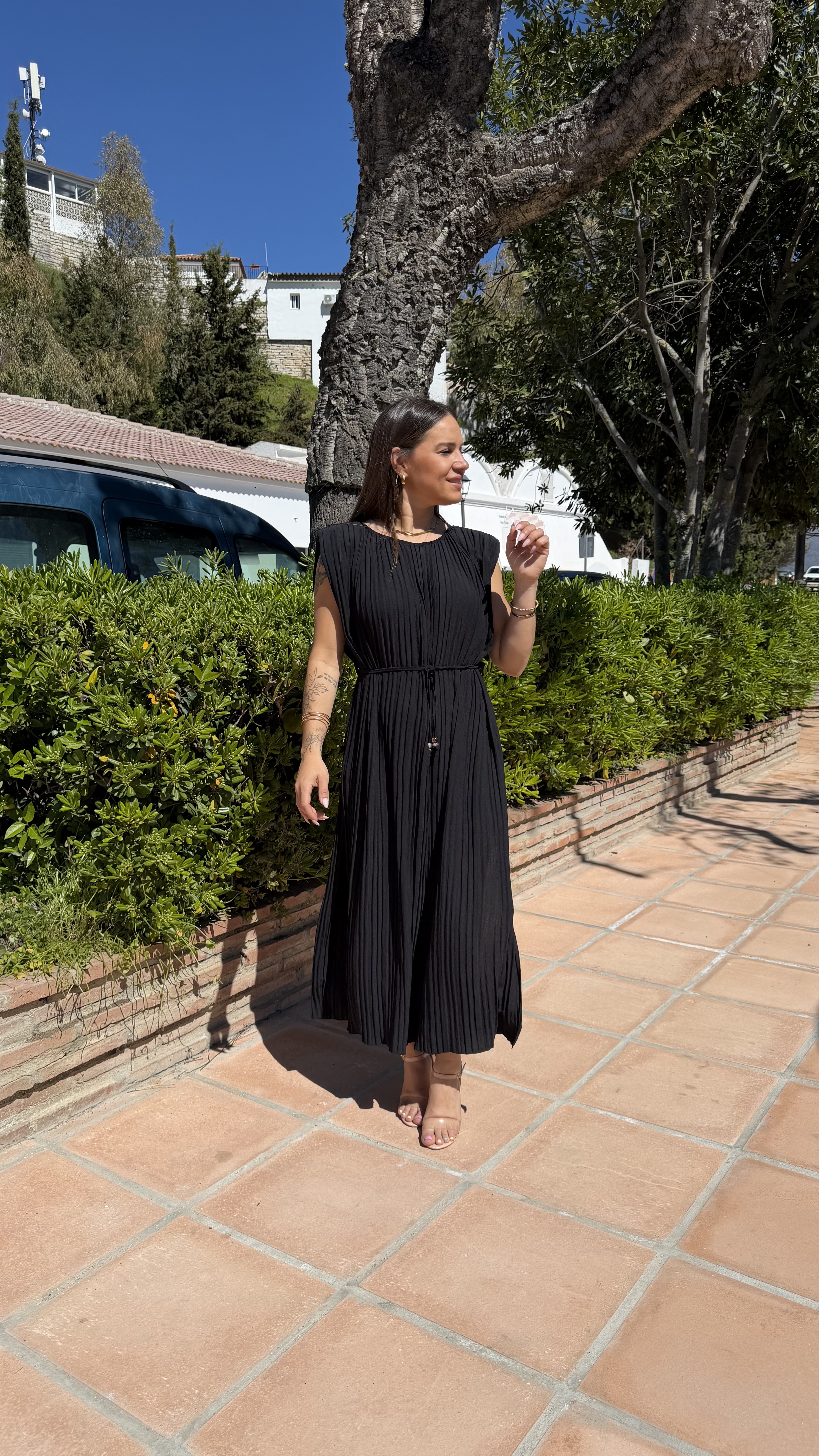 Vestido plisado hombreras – Negro
